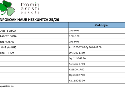 2 urteko umeen ezaugarri eta behar izanei erantzuna emateko, ikastetxeak hauen sarrera/irteera ordutegi malgua dauka. Ordutegi hauen bitartez, umeen eta familien ongizana eta lasaitasuna bilatzen da, hasierako urte zail eta berezi hauek errazagoak bihurtzeko helburuarekin. Profesionalek prestatutako egokitzapen batekin hasten dugu ikasturtea, behar izan guztiak kontuan hartuz.