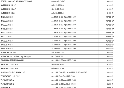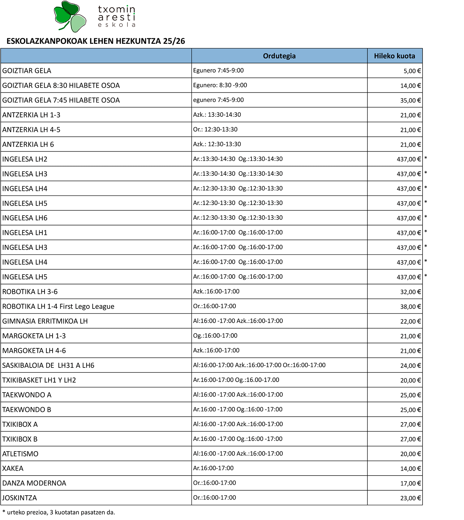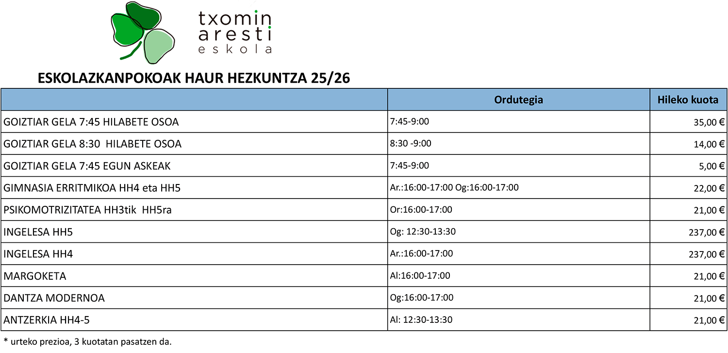 Eskolaz kanpoko ekintza hauek Guraso Elkarteak eskeinitakoak izango dira, beti ere ikastetxearen babes eta laguntzarekin. Ekintza hauen helburua umeen garapen integralean laguntzean datza, bakoitzak dituen interes eta behar izanei erantzuna emanez. Ekintza hauek eskeintzen dituzten aukerak anitzak dira, parte harzen duten ikasle kopuru ahalik eta zabalena izateko.